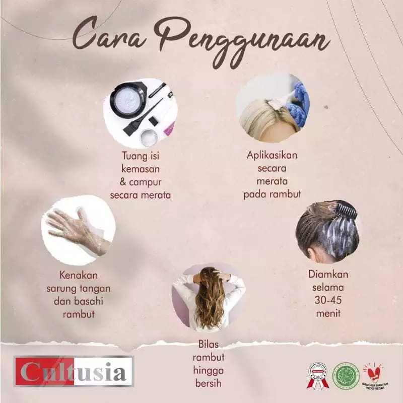 Siapkan wadah dan campurkan Cream Pewarna dengan Developer dgn perbandingan 1:1 dan aduk secara merata kemudian oleskan keseluruh bagian rambut dengan kuas atau sisir, tunggu 30-45 menit, jika warna belum terlalu tampak bisa ditambah waktunya 15 menit.